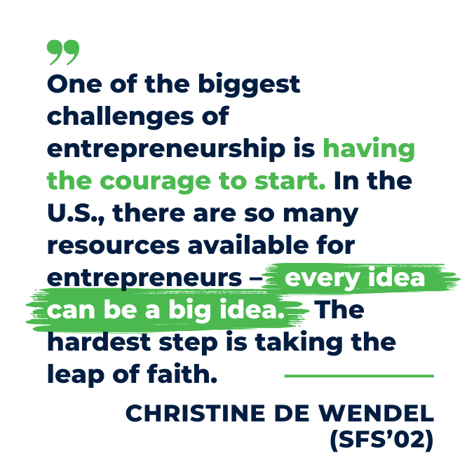 My biggest piece of advice, especially if you are just finishing up school, is that you should give it a shot. One of the biggest challenges of entrepreneurship is having the courage to start. In the U.S., there are so many resources available for entrepreneurs – every idea can be a big idea. The hardest step is taking the leap of faith. My example is I started my first company at 40, so it took me a while to get there. It takes quite a bit of courage to make that decision. It is absolutely worth it and incredibly fulfilling to make that jump.